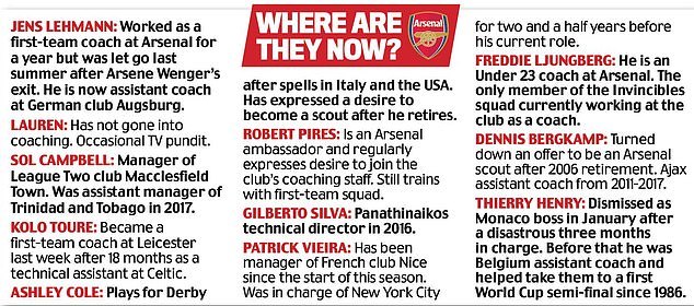 《每日邮报》还列出了阿森纳昔日不败阵容球员现在的去向:莱曼乃奥格斯堡助教,劳伦偶然客串评论员,坎贝尔在英乙执教,小图雷在莱斯特城当教练,阿科尔还没退役,但已经表态将来想执教,皮雷乃阿森纳大使,也表态想要执教,吉尔伯托在帕纳辛科科斯当技术总监,维埃拉执教尼斯,永贝里执教阿森纳U23,博格坎普在2006年拒绝在阿森纳当球探,曾担任阿贾克斯助教6年,亨利刚刚被摩纳哥炒掉。