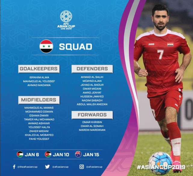 亚洲杯开赛在即,24支球队均公布了23人大名单。2017年亚洲足球先生赫里宾领衔叙利亚国家队。