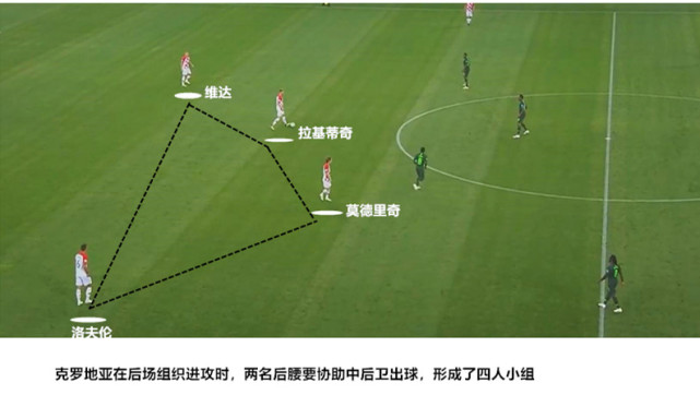 如上图所示,在后场组织进攻时,克罗地亚的两名边后卫无需承担接应的任务,而是尽量前插到对方半场,从而将尼日利亚的整体阵型压迫到低位。而拉基蒂奇和莫德里奇则对应的回到两名中卫身前拿球组织进攻,此举意在解放两名边后卫的助攻能力,在前场增加进攻人数。