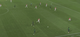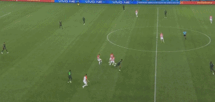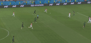 如上图则是摩西在右路的突破,尽管克罗地亚有两名球员上前包夹限制,但他还是准确的将球分出来并与队友做了一个撞墙配合突入到禁区。